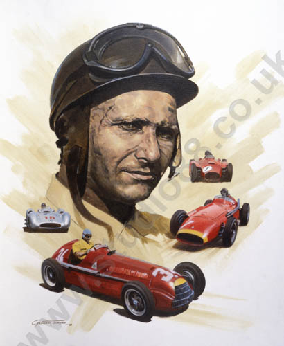 Five times Formula One World Champion, Juan Manuel Fangio is shown in Graham Turner's portrait montage surrounded by the cars with which he achieved so much success - Mercedes, Lancia Ferrari, Maserati 250F and Alfa Romeo 158.