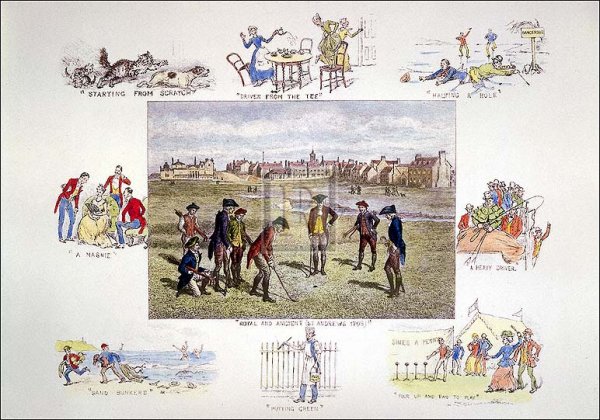 The title refers to the premier golf club at St. Andrew's, Fifeshire, which is the headquarters of the game. This print is a companion to "Gunfire, a Good Start" (HCQ11) and is in similar humorous vein. The margin of the print is decorated with visual puns on golfing terms